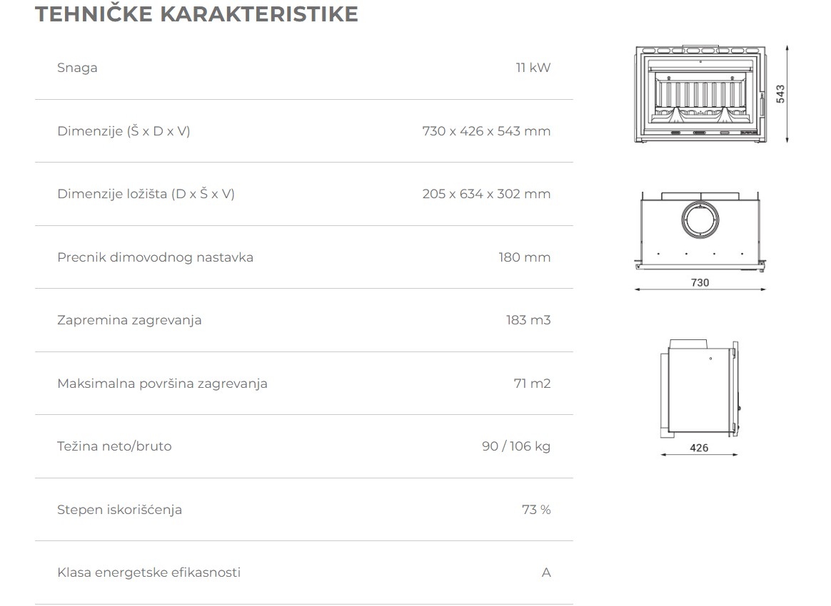Ugradni kamin, velike snage, podjednako se uklapa u tradicionalne ali i savremen ambijente. Prostrano ložište i velika staklena površina na vratima ložištaomogućava vidljivost plamena i potpuni ugođaj.