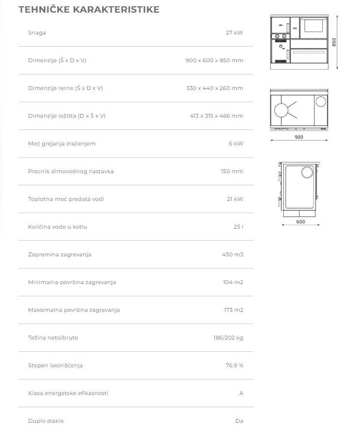- Štednjak izrađen od livenih i limenih delova koji su zaštićeni farbom, lakom i emajlom otpornim na visoke temperature.
